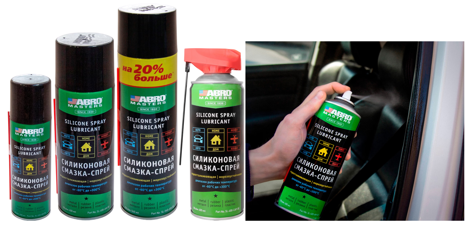 Идеальное решение, чтобы двери не примерзали, а резиновые уплотнители оставались целыми — это силиконовые смазки-спрей ABRO MASTERS.