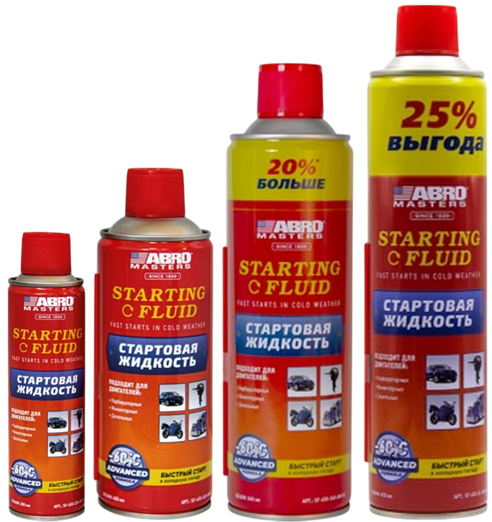 В сильный мороз могут понадобиться средства, которые невозможно применить заранее. Например, когда и бензиновый, и дизельный двигатель испытывают трудности с запуском из-за низких температур — используйте стартовую жидкость ABRO MASTERS.